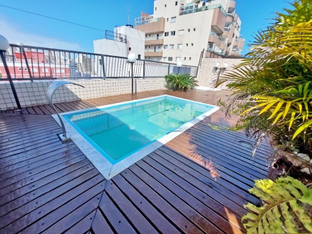 A cobertura conta com uma piscina privativa, um espaço gourmet completo com churrasqueira e forno, e um terraço com uma vista maravilhosa para o oceano.