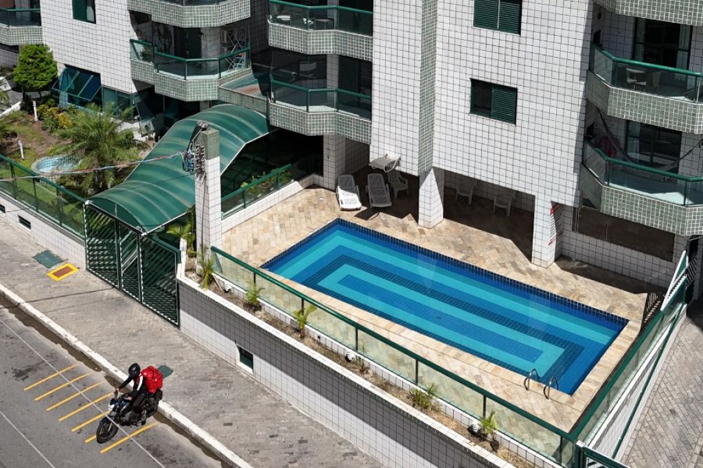 Edifício com salão de jogos, salão de festas, piscinas.