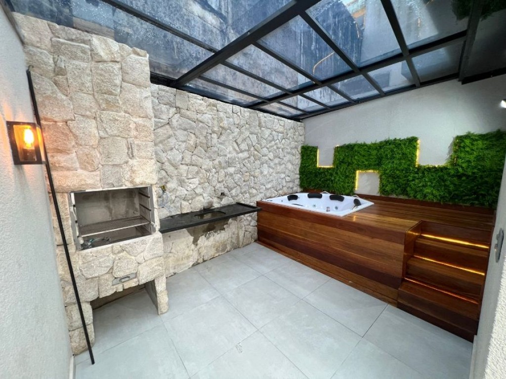 Área gourmet com cobertura retrátil, ofurô, parede decorativa com pedras naturais e jardim vertical