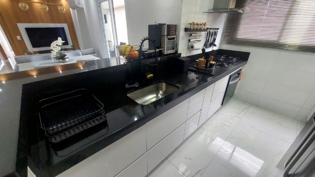Varanda gourmet com churrasqueira à gás.
