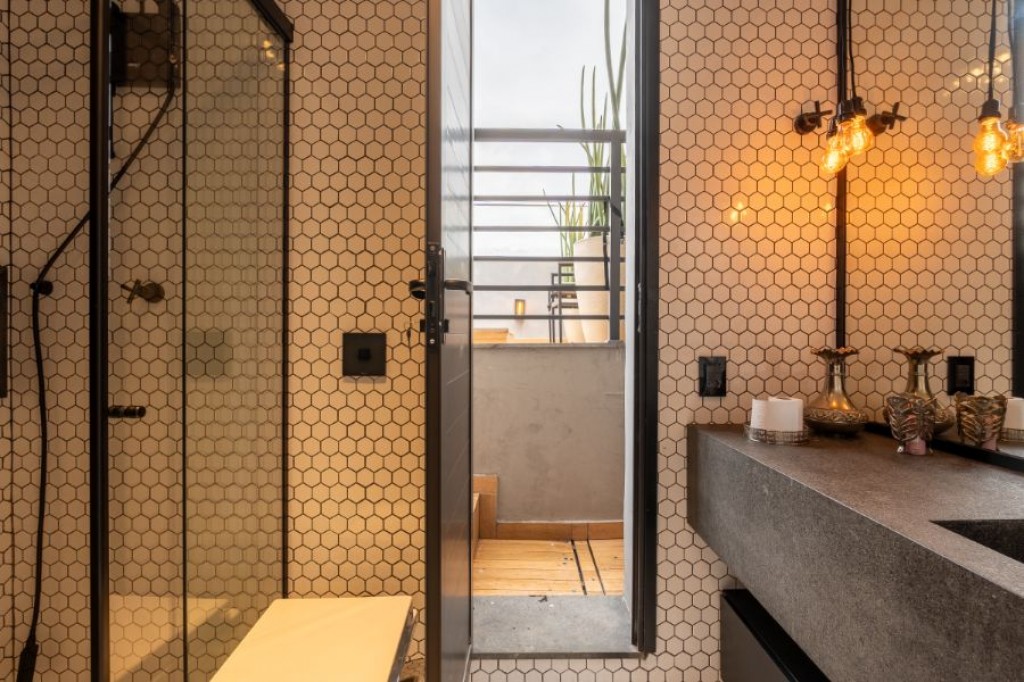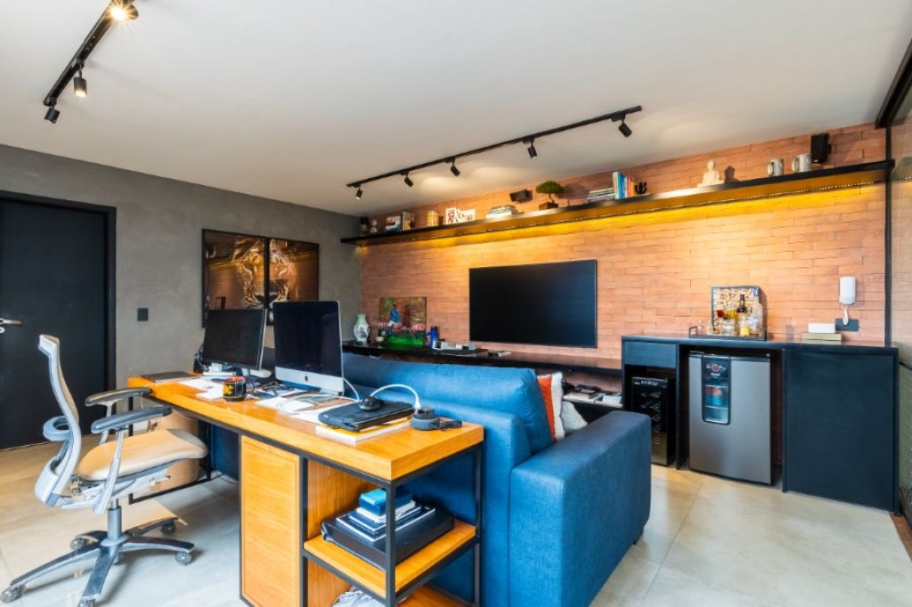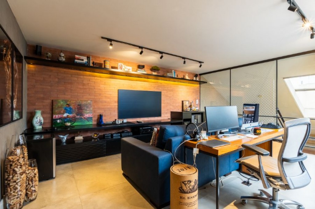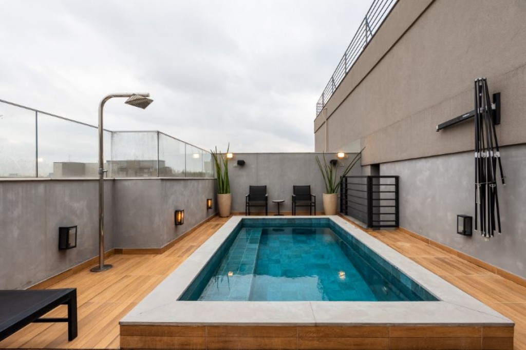 A área externa também conta com uma piscina com controle de temperatura, perfeita para uso em todas as estações. Da piscina, há acesso direto a um banheiro que se conecta à sauna, proporcionando praticidade e integração entre os ambientes. Além disso, há uma sala de TV/escritório, ideal para momentos de relaxamento ou para o home office.