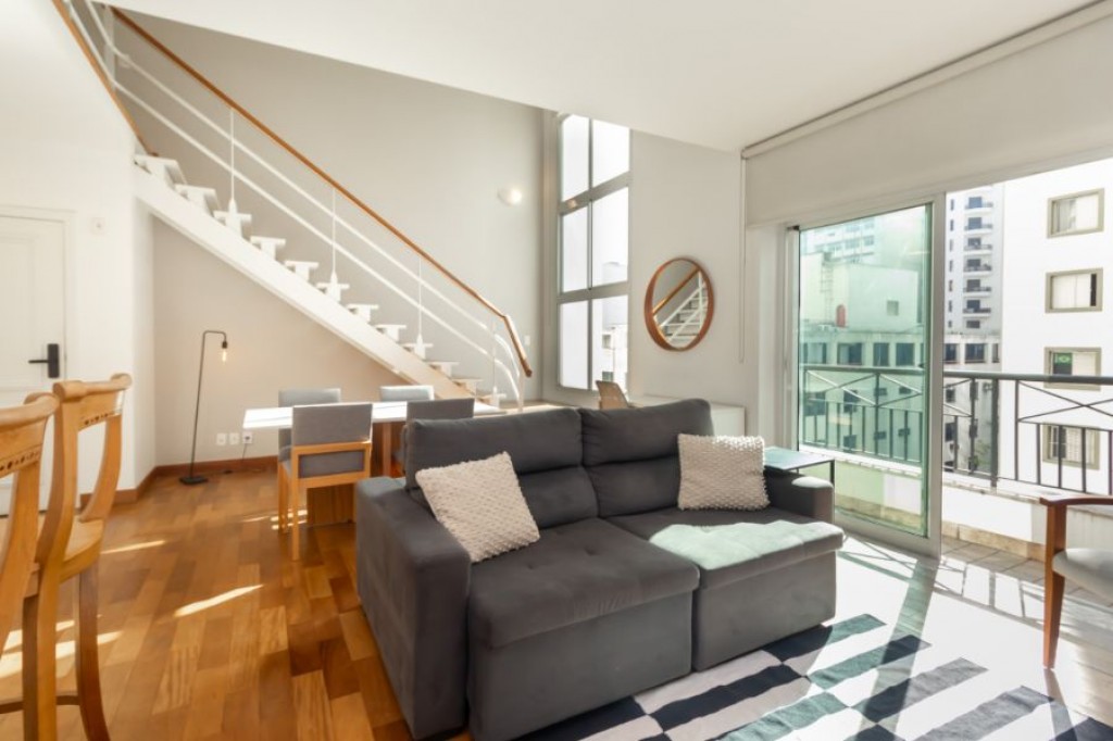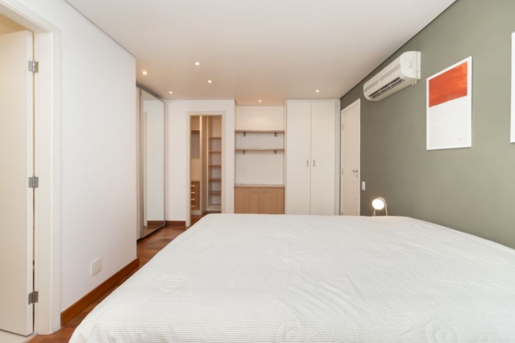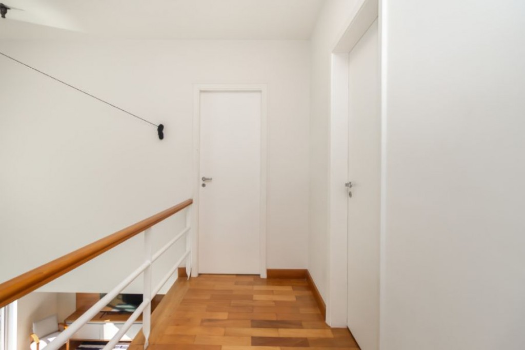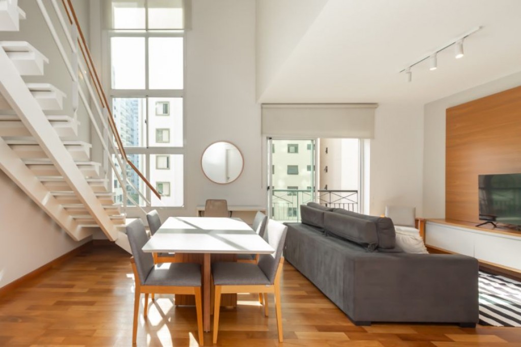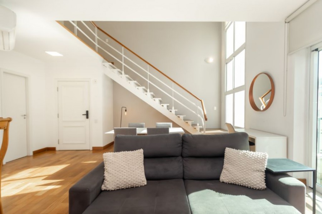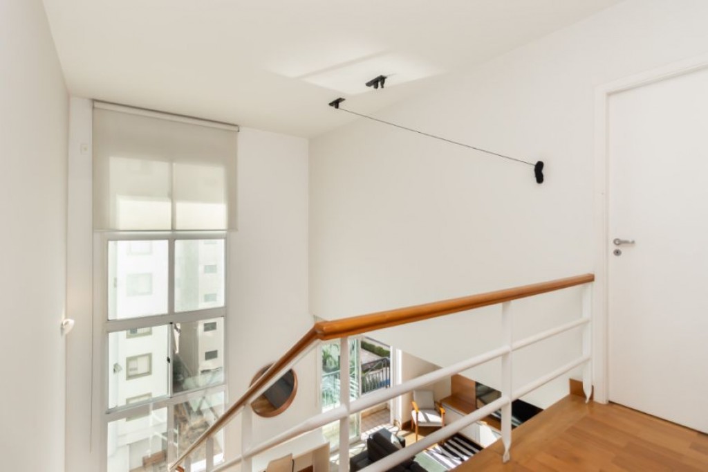 Neste apartamento cheio de personalidade, o living com pé-direito duplo impressiona logo na entrada. A luz da manhã invade a sala, criando um clima acolhedor e sereno, um convite para curtir o sol entrando pelas janelas piso-teto e sentir o silêncio raro em São Paulo. Da varanda, a vista é para a piscina do condomínio, recém-reformada, o que valoriza ainda mais a experiência de morar aqui.