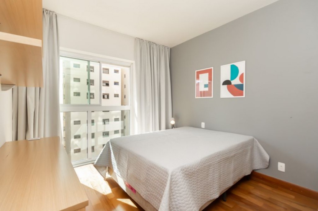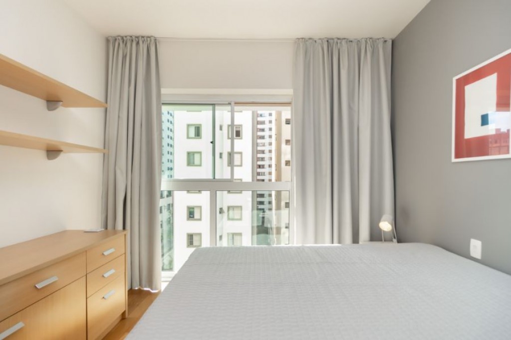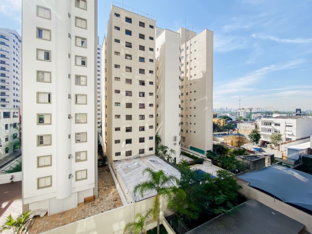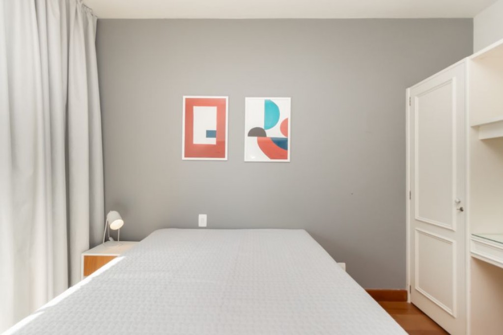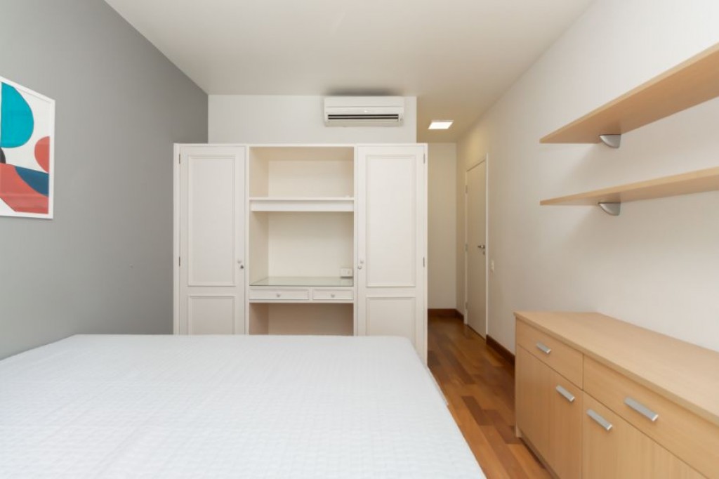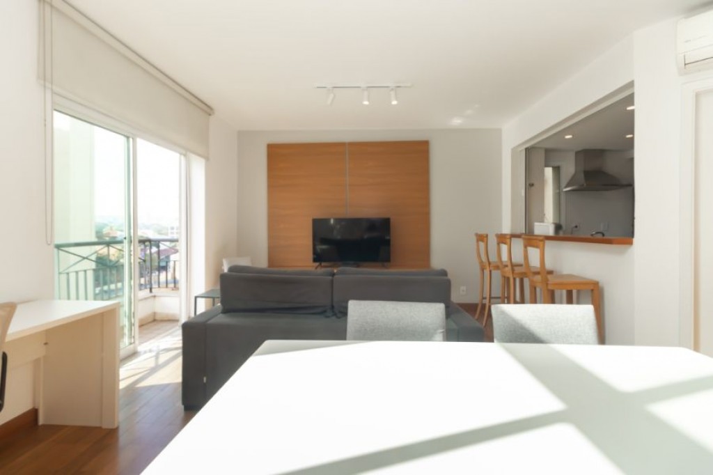 Neste apartamento cheio de personalidade, o living com pé-direito duplo impressiona logo na entrada. A luz da manhã invade a sala, criando um clima acolhedor e sereno, um convite para curtir o sol entrando pelas janelas piso-teto e sentir o silêncio raro em São Paulo. Da varanda, a vista é para a piscina do condomínio, recém-reformada, o que valoriza ainda mais a experiência de morar aqui.