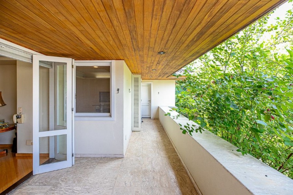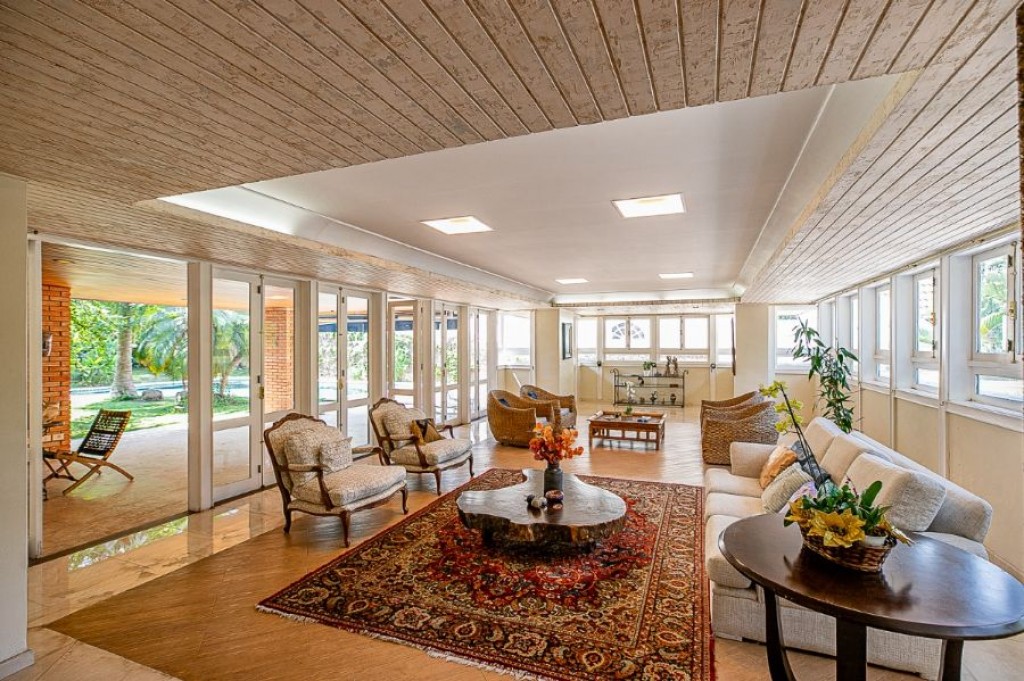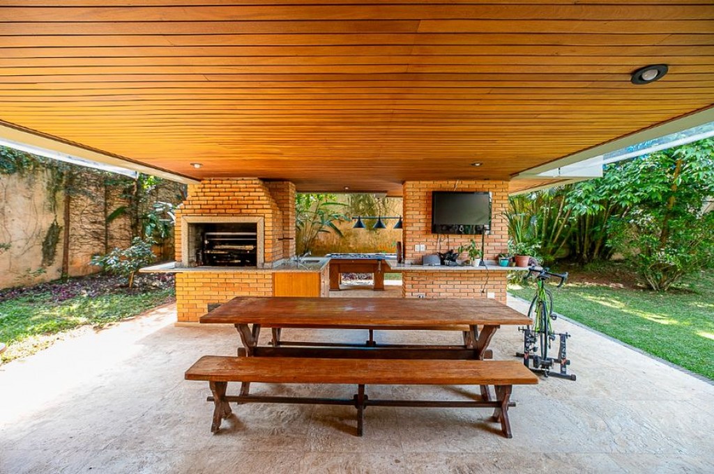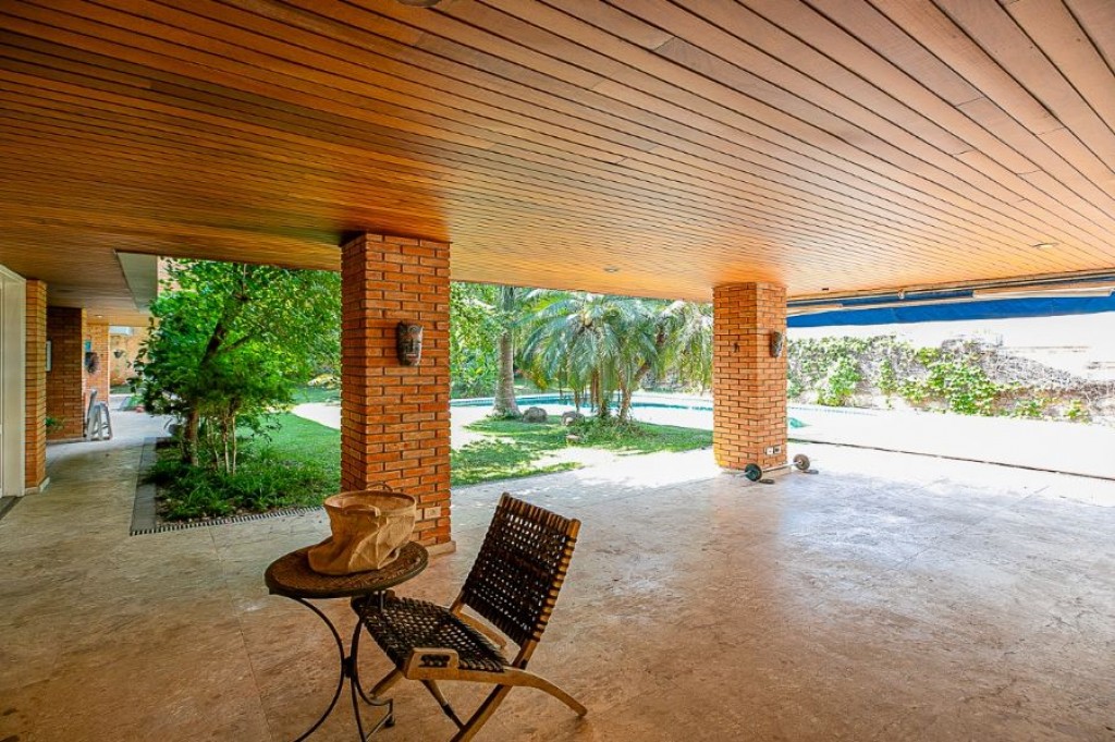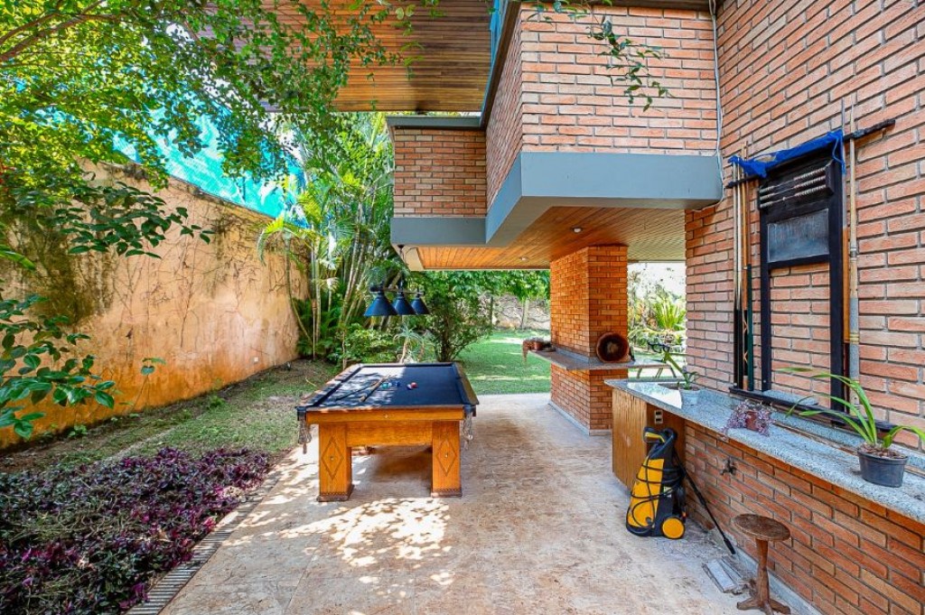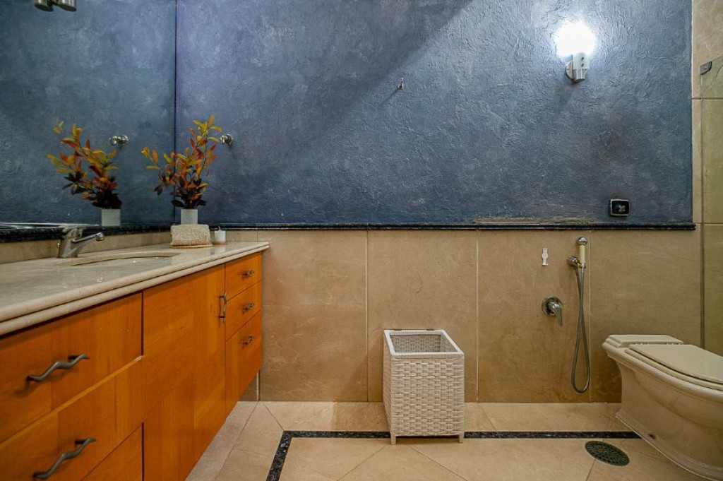 A garagem comporta no total oito carros, sendo quatro vagas na área coberta e mais quatro descobertas. Na área de serviço, há duas dependências funcionais e um banheiro de apoio.