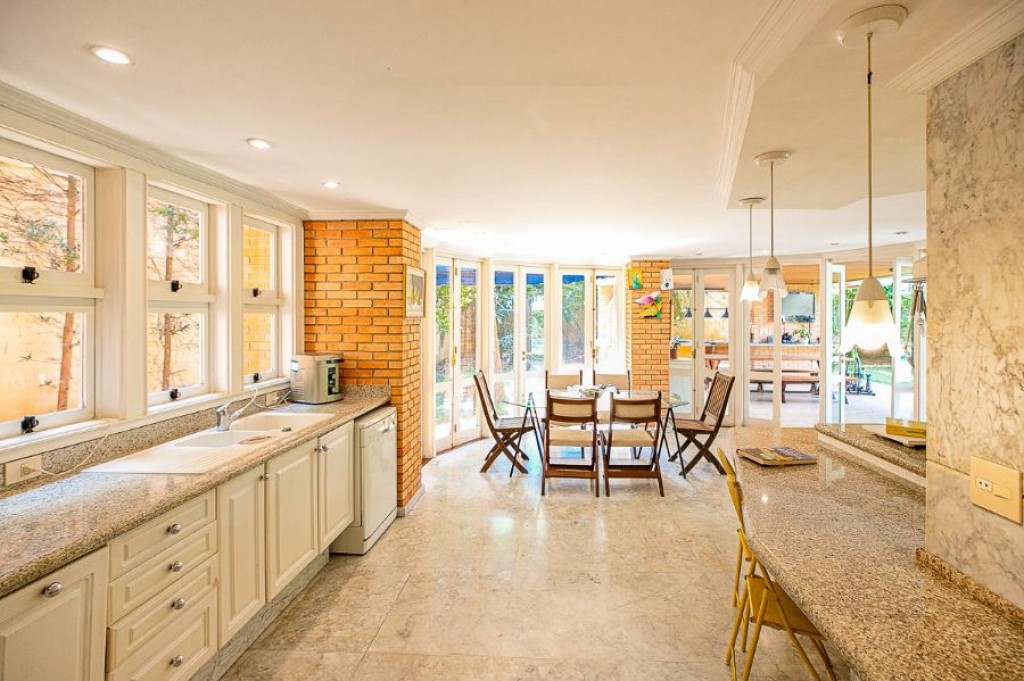 O hall de entrada dá acesso à ampla sala de estar para três ambientes integrados, proporcionando um layout elegante e aconchegante para receber amigos e familiares. A sala de jantar, generosa em tamanho, acomoda facilmente grandes encontros. A cozinha espaçosa com duas bancadas de pia e uma ilha central, é um sonho de quem gosta de cozinhar e manter um ambiente organizado, Amplas portas de vidro e janelas fazem a integração com a varanda externa, a área gourmet e com o lindo jardim gramado e com árvores - sendo algumas delas frutíferas - onde se encontra a piscina aquecida com design diferenciado e com deck de madeira. Tudo planejado para criar um ambiente tranquilo e aconchegante, ideal para relaxar ao som dos pássaros e em contato com a natureza.